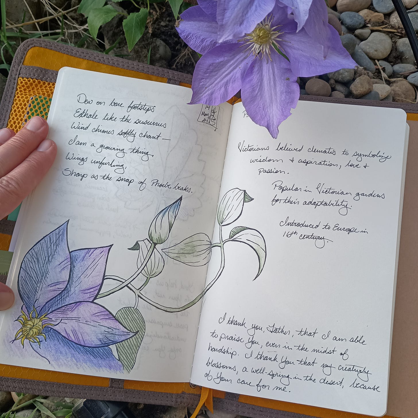 14th of May, 10:05amHeather DickinsonMay 17, 202421ShareDew on bare footstepsExhale like the susurrusWind chimes softly chant —I am a growing thingWings unfurlingSharp as the snap of Phoebe beaks.(2024)Heather in the Blue Mountains is a reader-supported publication. To receive new posts and support more poems, more sketchbook adventures, art expeditions, and lessons, consider becoming a free or paid subscriber.SubscribePreviousNext