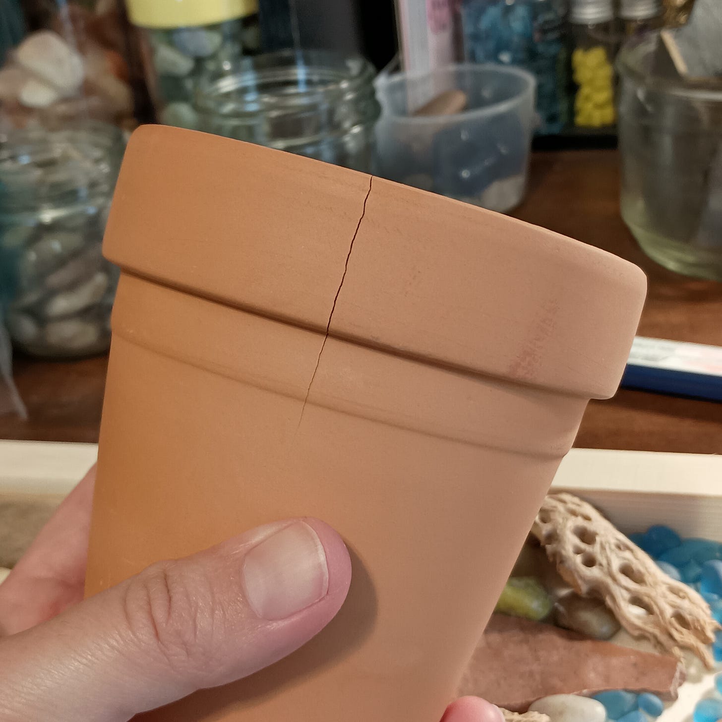 I know I want to see how the finished project looks, even if it’s uncomfortable to be seen. I wouldn’t have taken that little terracotta pot if it had been fully intact, after all. In this new art style I’m trying, I have no use for perfect. I needed that crack in the side. I wanted imperfect.