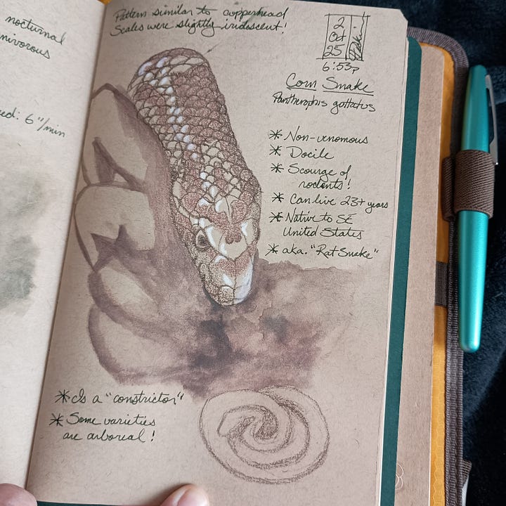 What began as a stylistic experiment, I am now growing particularly fond of. There’s something calming and almost “old-world” about it. The pencils are not a true trois crayonnes selection (that would be black/sanguine/white, as opposed to the brown/sepia/white that I’m using), but the mimicry is there even if subtler. I also appreciate the texture shifts between the smooth fountain pen text, the grittier pencil, and the soft muted watercolor. Yes, very satisfying.