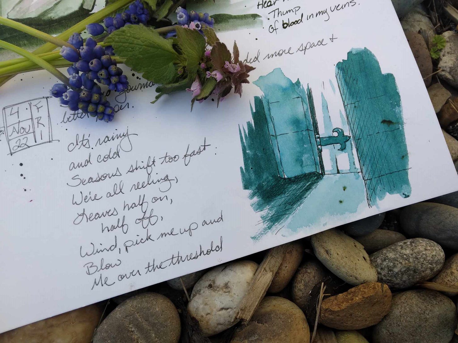 It’s rainy and cold; Seasons shift too fast We’re all reeling, Leaves half on, half off, Wind, pick me up and Blow Me over the threshold.
