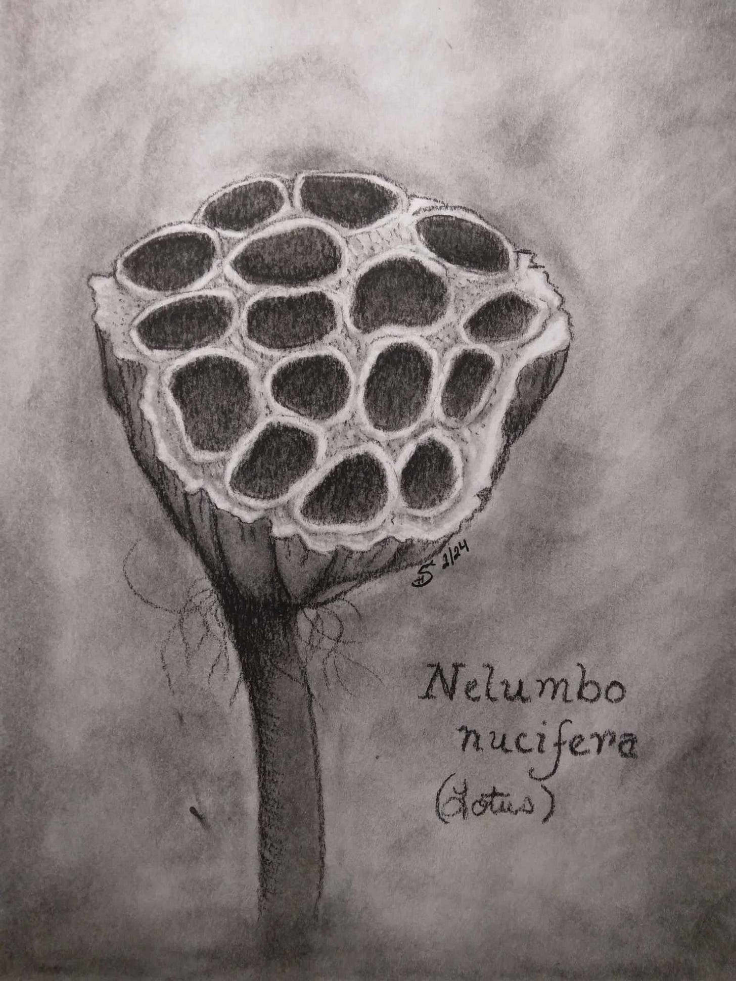 The lotus is a fascinating plant. Growing in close to 8 feet of water, she brings blessing wherever she is planted -- purifying water, removing toxins and increasing oxygen levels in the aquatic environment, feeding people and animals with edible shoots, seeds, and leaves, and beautifying her environment with lovely flowers and unique pods like the one I've drawn here.