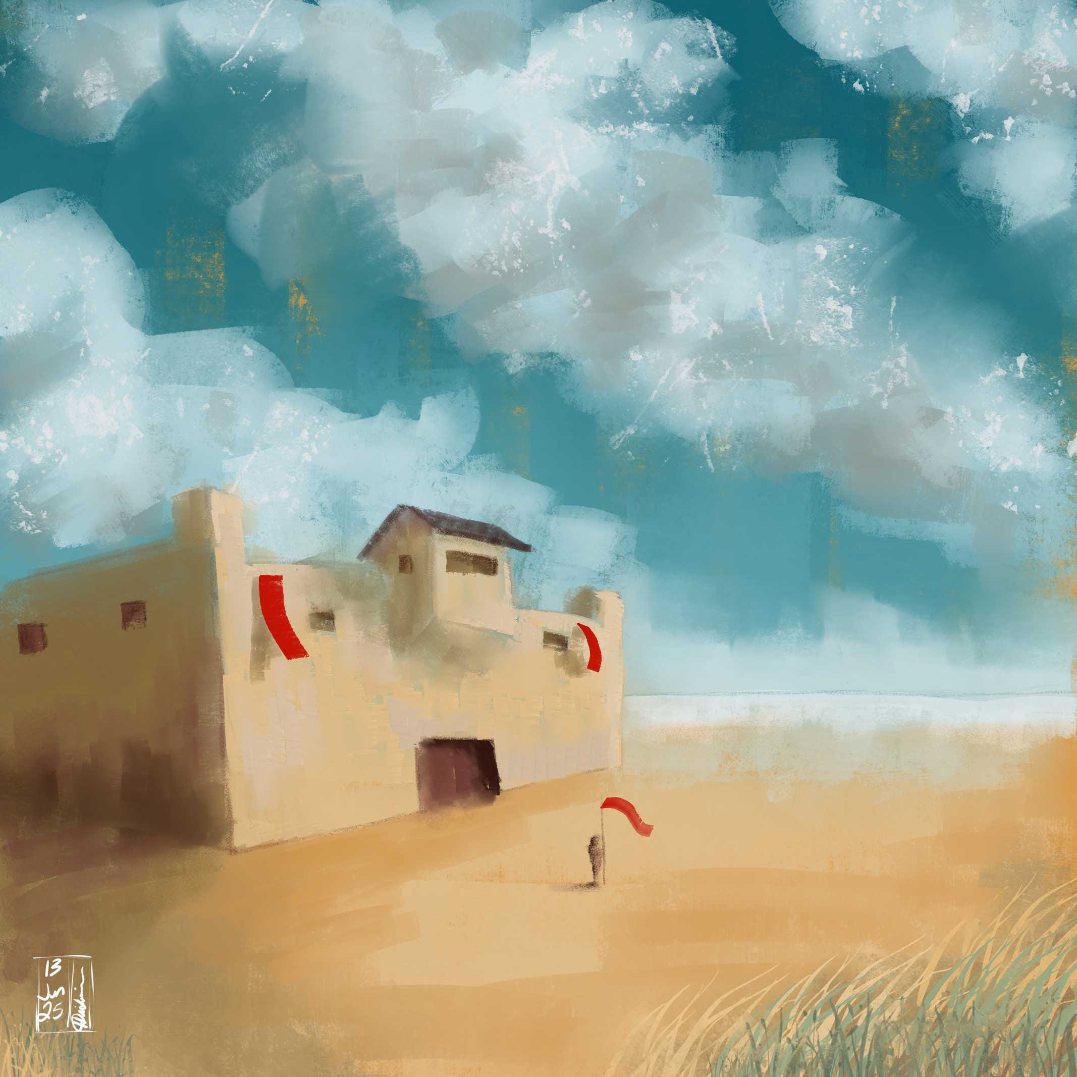 At least there is a breeze. The pennants whip and snap in it, mimicking every footfall across the dried and salted earth. Behind him, the city lay silent. The wind sighed and mourned across eaves, rattled derelict shutters, and there wasn’t even the cry of a gull to break up the sound. Just the gasp and exhale of hot wind as it rolled across the deserted landscape.