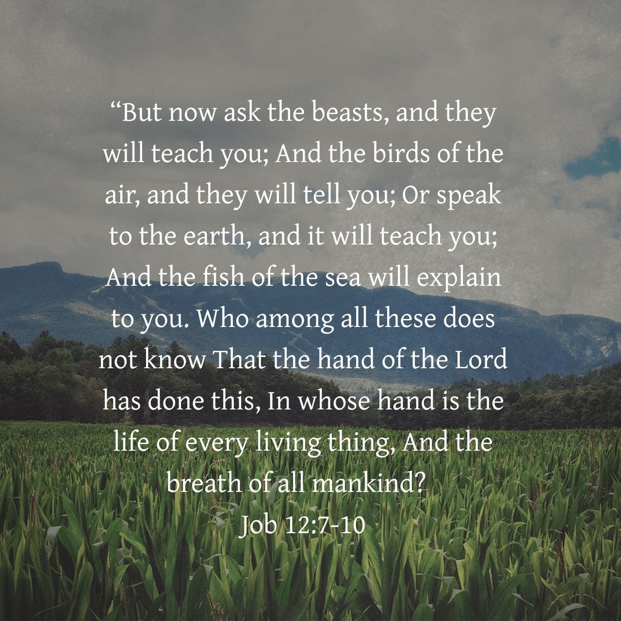 “But now ask the beasts, and they will teach you; And the birds of the air, and they will tell you; Or speak to the earth, and it will teach you; And the fish of the sea will explain to you; Who among all these does not know that the hand of the Lord has done this, In whose hand is the life of every living thing, And the breath of all mankind?”