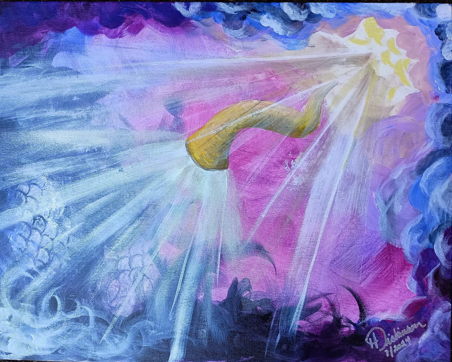 The artwork is of a golden shofar emerging from clouds that are lit from within, surrounded by light beams. The shofar blows, and the sound emerges as light that pierces the darkness and exposes things long hidden.